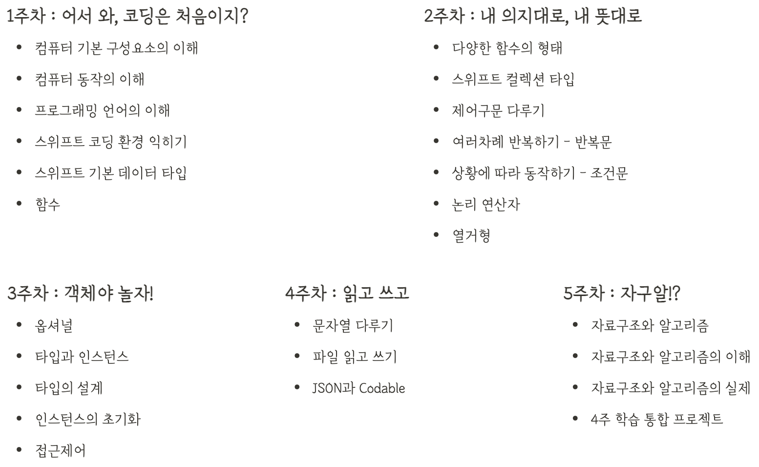 파이썬이나 JavaScript와는 달리 입문 수준에서 Swift를 다루는 콘텐츠는 많지 않다는 게 큰 걸림돌이다. Swift로 코딩 기초를 알려주는 수업이 없어서 JavaScript/Node.js/Java 강의를 전전하며 기초 문법을 배웠다. 변수/상수, 반복문/조건문 등의 개념은 배울 수 있었지만, 이 개념을 활용해 Swift로 어떻게 프로젝트를 진행할지 잘 그려지지 않았다. - 입문 다음 단계
