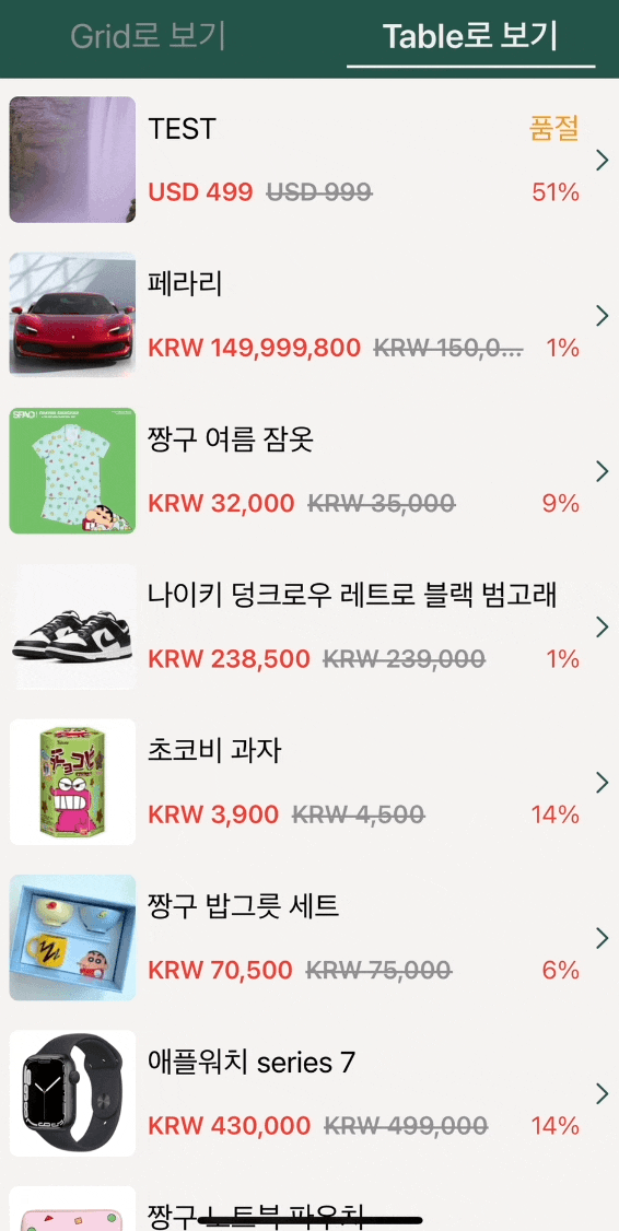 🔍 상품 목록을 좀 더 자세히 보면, 상단의 메뉴 버튼을 통해 Grid 형태와 Table 형태 2개 종류로 나타냈다.