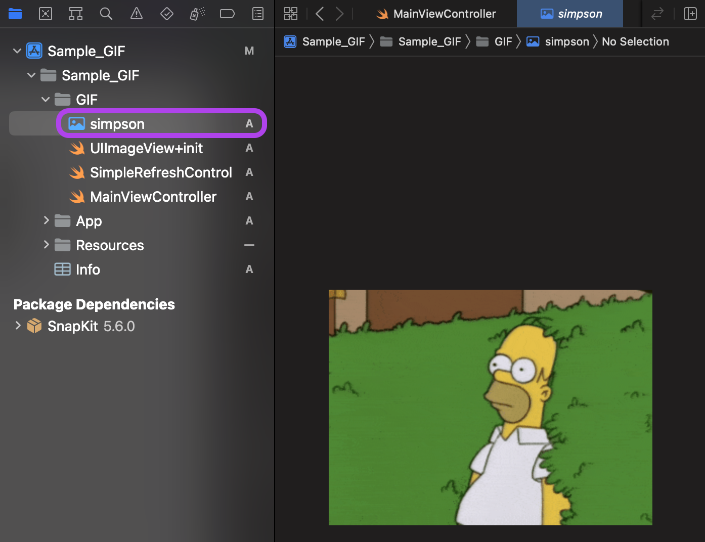 gif 파일이름 "simpson"을 넣어서 loadingImageView를 초기화했다. - 그다음 RefreshControl 위에 addSubview를 하고, constraints를 설정한다.