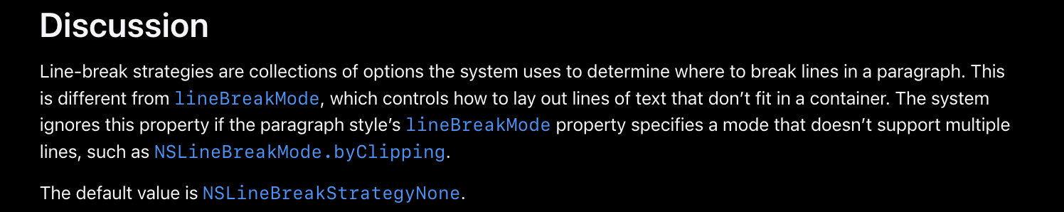- Apple Developer Documentation > NSParagraphStyle - lineBreakStrategy