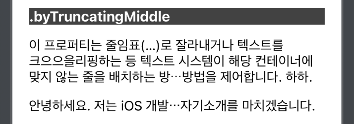 - .byTruncatingMiddle + .hangulWordPriority : 컨테이너 마지막 줄에서 텍스트 중간이 ... 처리된다.