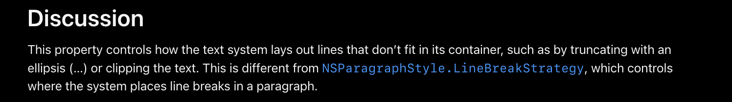 - Apple Developer Documentation > NSParagraphStyle - lineBreakMode