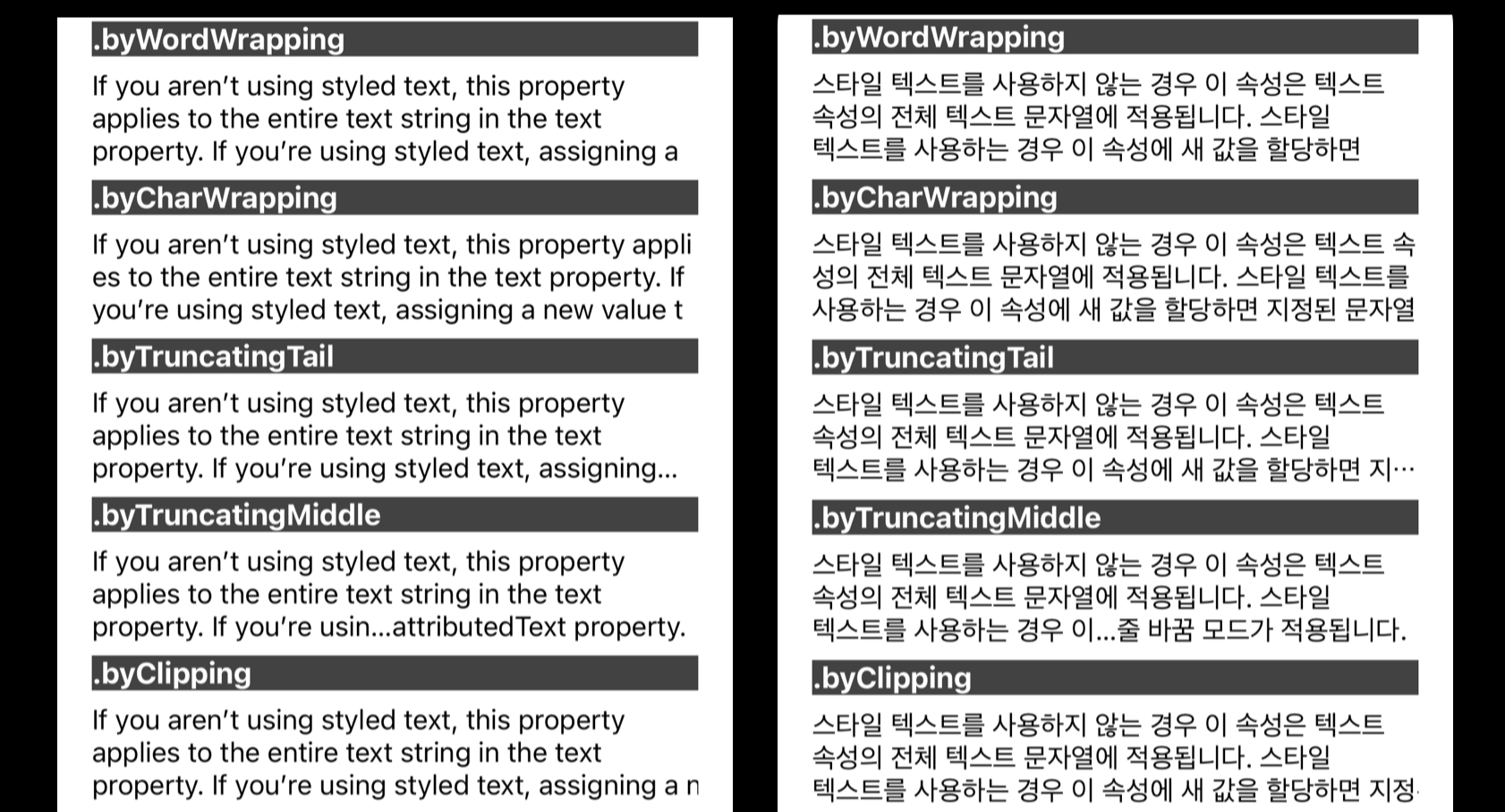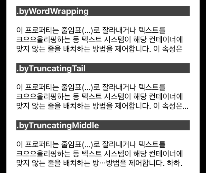 - byTruncatingTail : 텍스트 끝부분을 ...으로 자른다. 그리고 영단어가 쪼개지지 않는다.