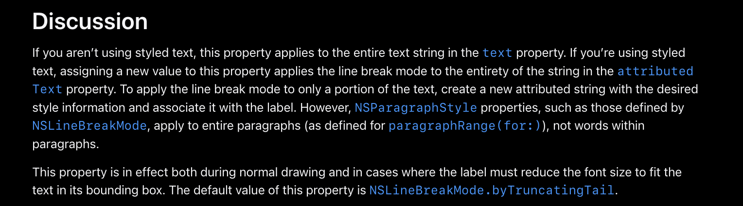 - attibutedText 미사용 시 : lineBreakMode가 text 프로퍼티의 문자열 전체에 직접 적용된다.