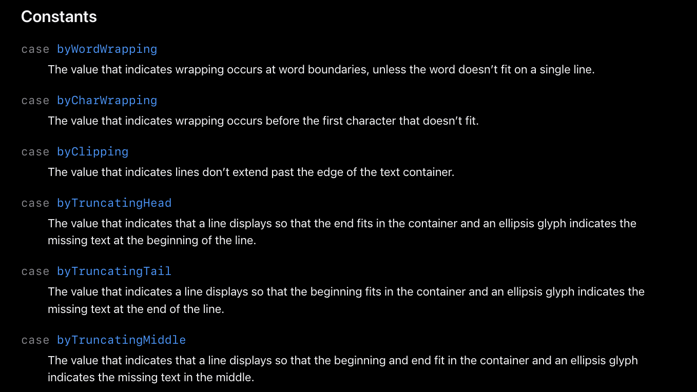 NSLineBreakMode 문서를 뒤져봐도 안나왔는데, 알고 보니 UILabel - lineBreakMode 문서가 따로 있었다.