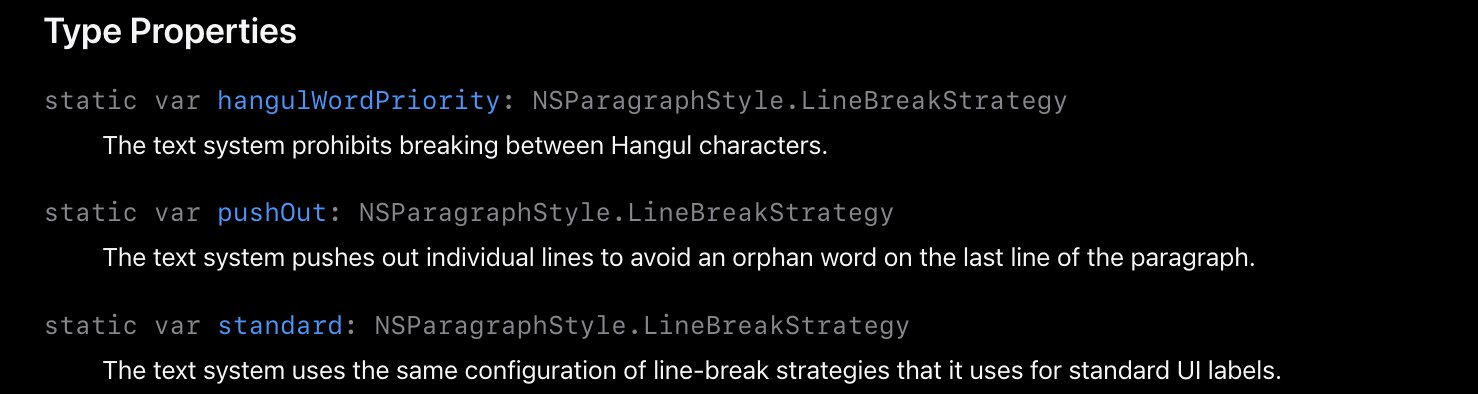 lineBreakStrategy의 종류는 enum이 아니라 structure 및 static 프로퍼티로 구현되어있다.