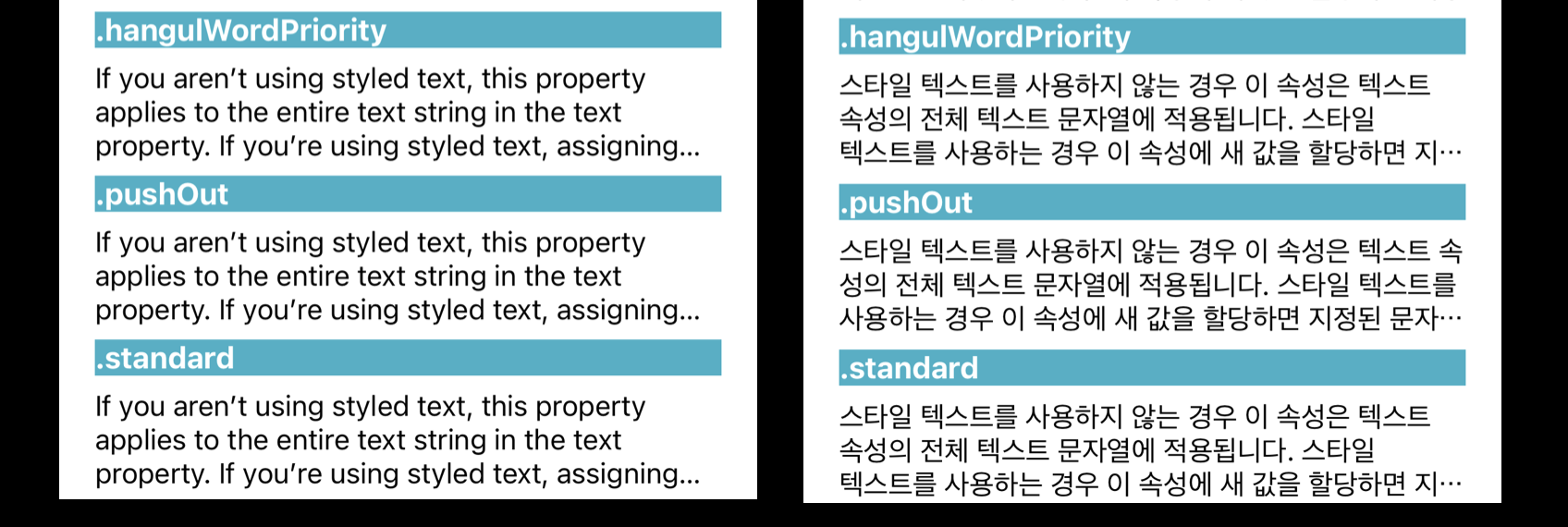 그래서 애플이 친절하게 이걸 추가해줬다. 당연히 한글을 쓰는 대부분의 상용 앱에서 활용한다. ✨✨✨ - .pushOut : 마지막 줄에 남겨진 단어가 동떨어지는 것을 방지하기 위해 개별 line을 밀어낸다.