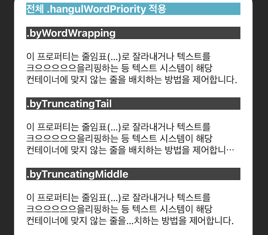 - .byTruncatingTail + .hangulWordPriority : 텍스트 끝이 ... 처리된다.