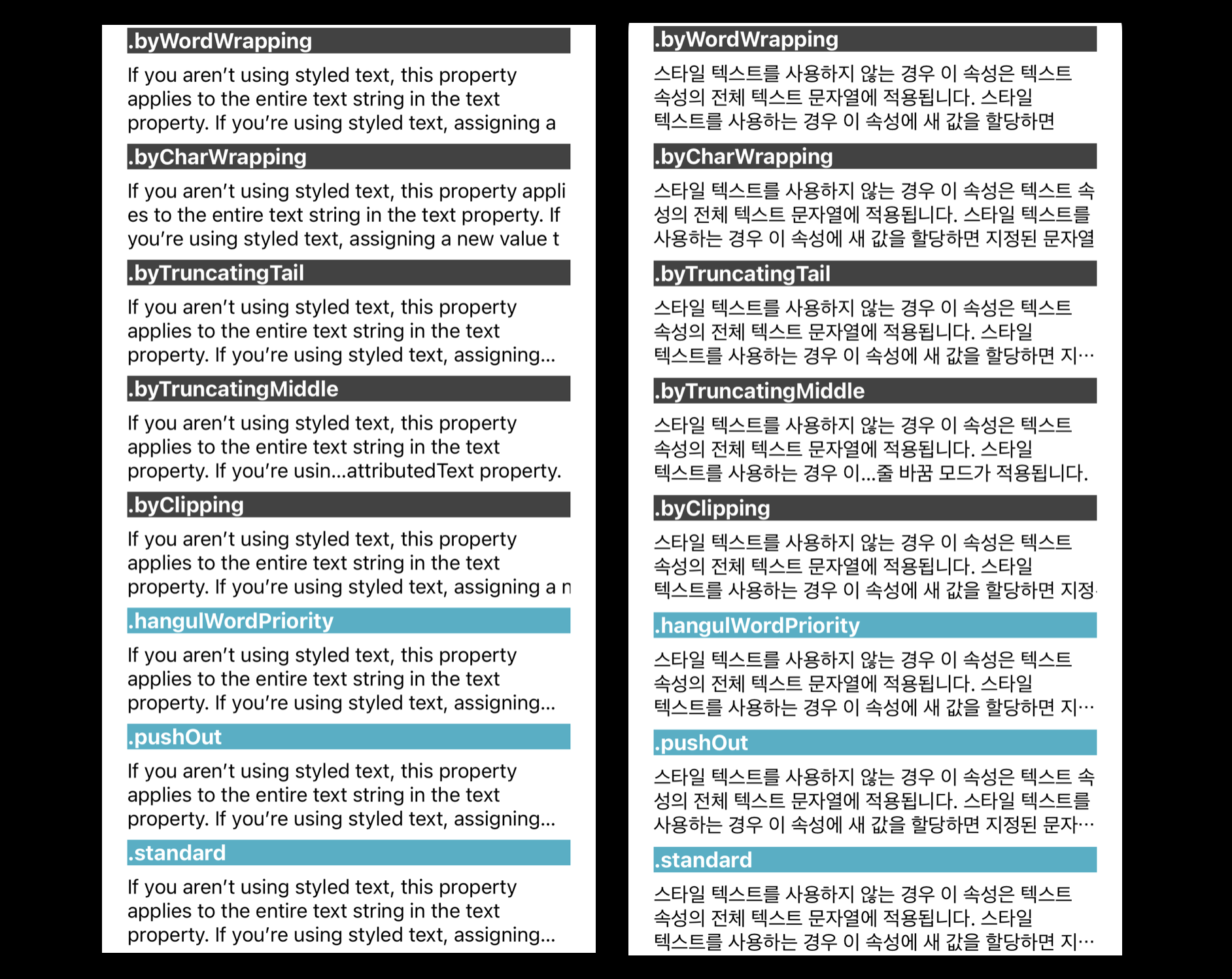 원하는 스타일에 따라 사용하면 될듯 - .byWordWrapping + .hangulWordPriority : 텍스트 끝이 ... 처리되지 않는다.