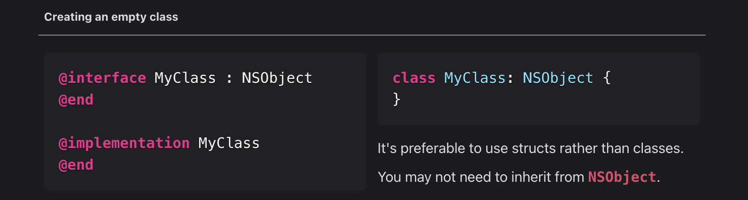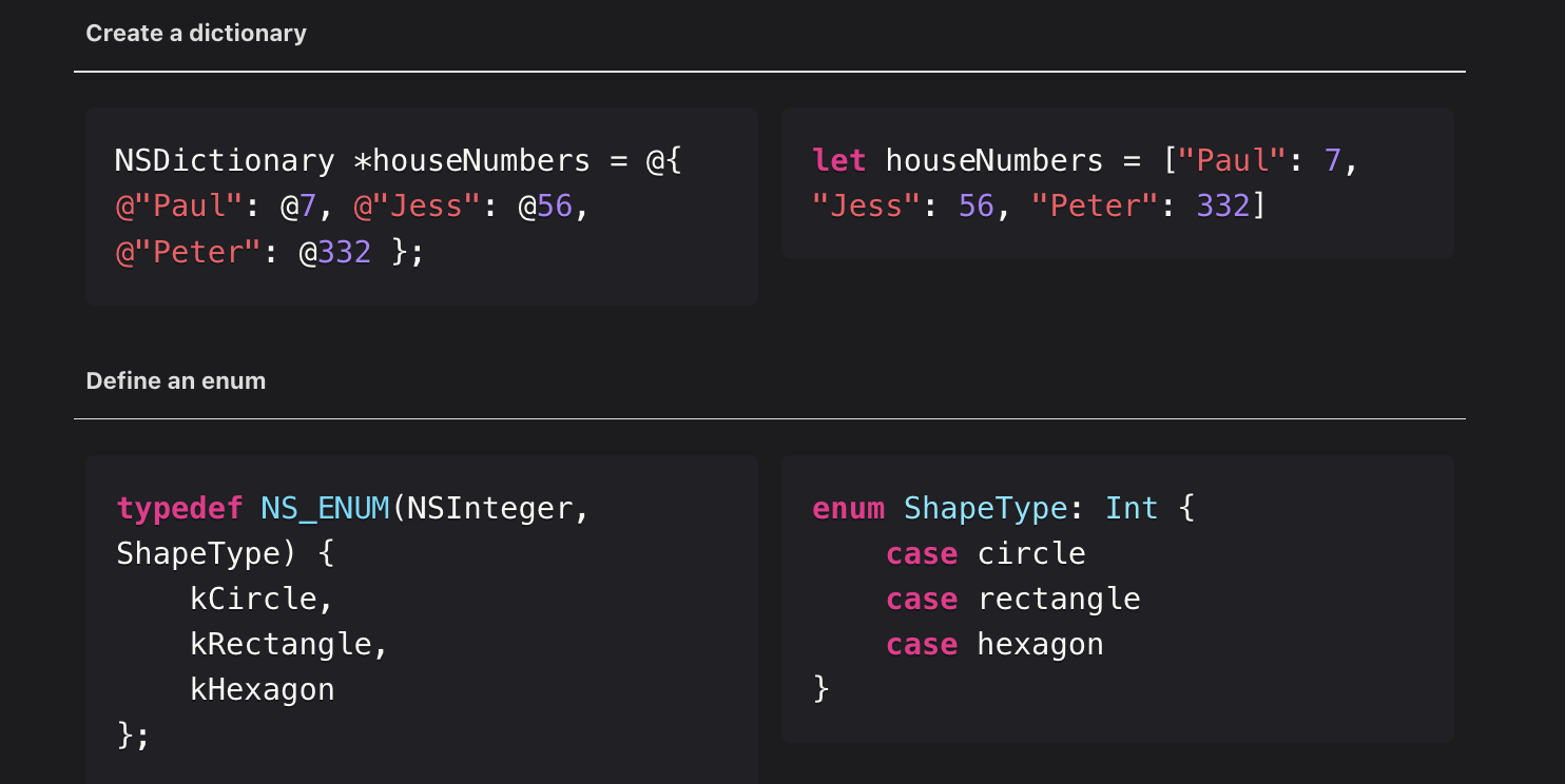 Objective-C 및 Swift를 비교한 Cheat sheet을 활용하는 것도 좋다.