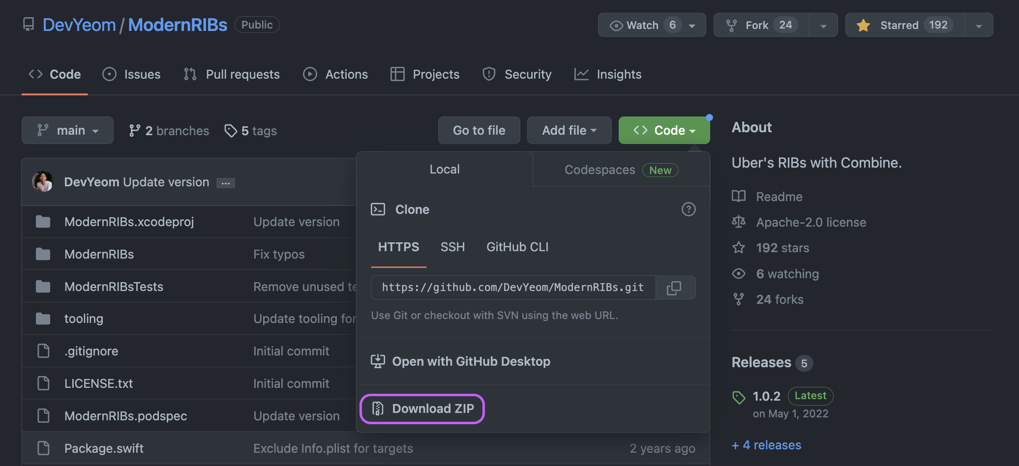 3. https://github.com/DevYeom/ModernRIBs 코드를 다운받는다.