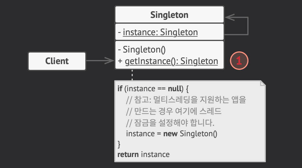 - 위 그림에서는 getInstance() 메서드를 통해 인스턴스를 반환하도록 했지만,