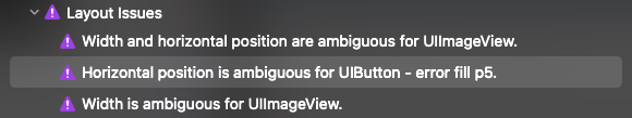 "Horizontal position is ambiguous for UIButton", "Width is ambiguous for UIButton" 등의 Layout issues가 뜬다.