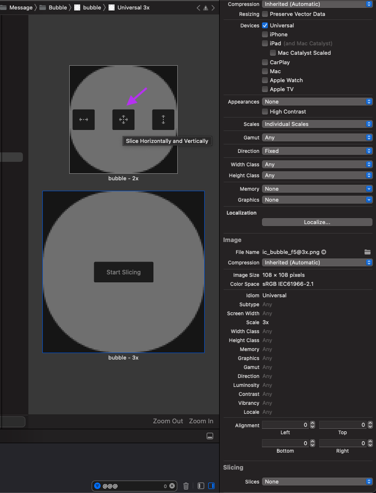 우하단의 Slicing 탭에서 Slices와 Center를 각각 설정한다.