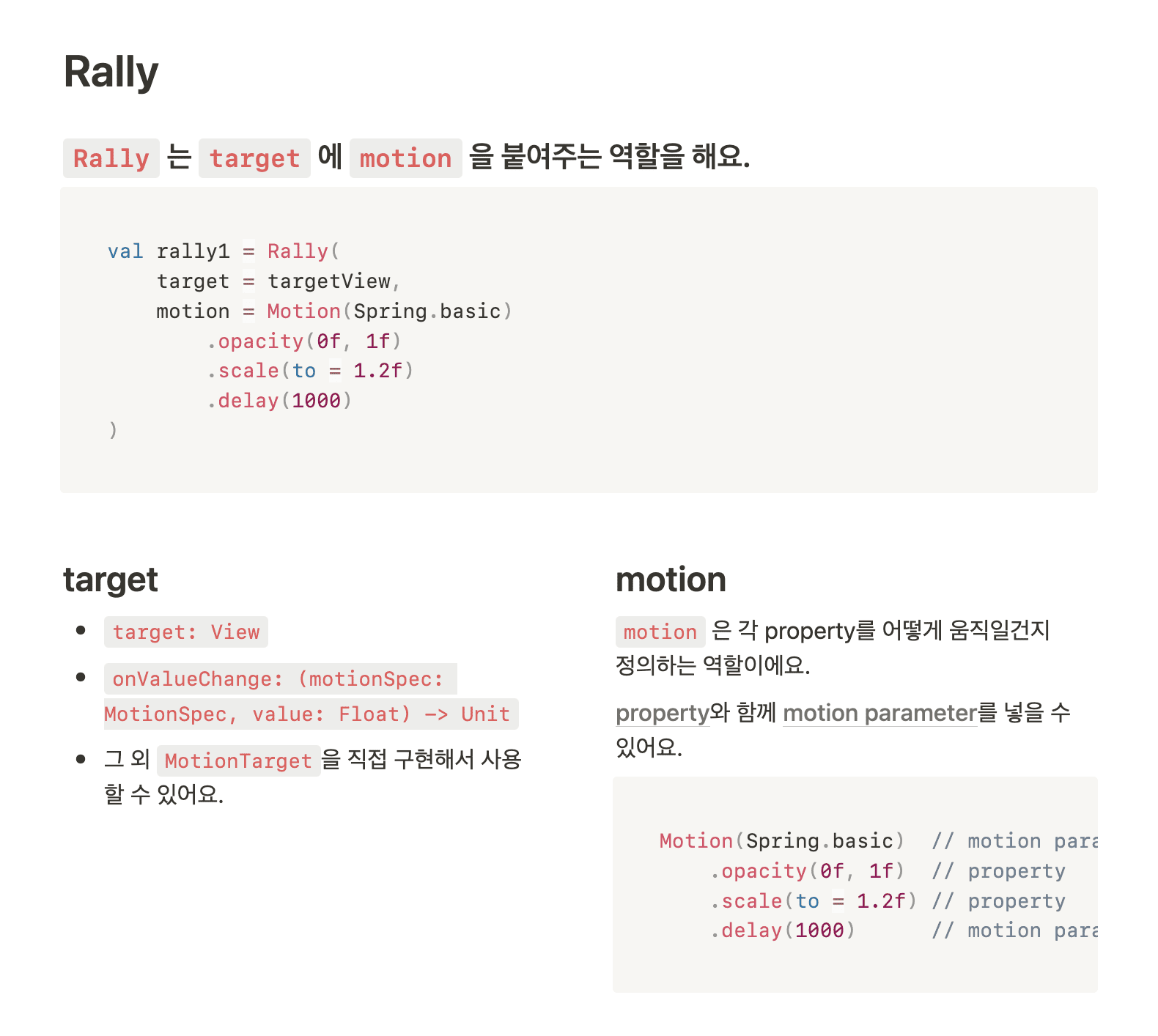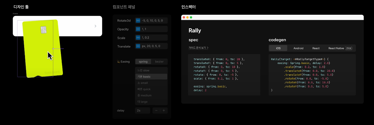 Andriod/iOS/Web에서 동일한 개발 언어와 로직을 사용하는 Rally라는 애니메이션 라이브러리를 만들게 됐다. - 작업 방법 : 디자이너가 프레이머로 인터랙션 컴포넌트를 사용해서 Motion을 만들면,