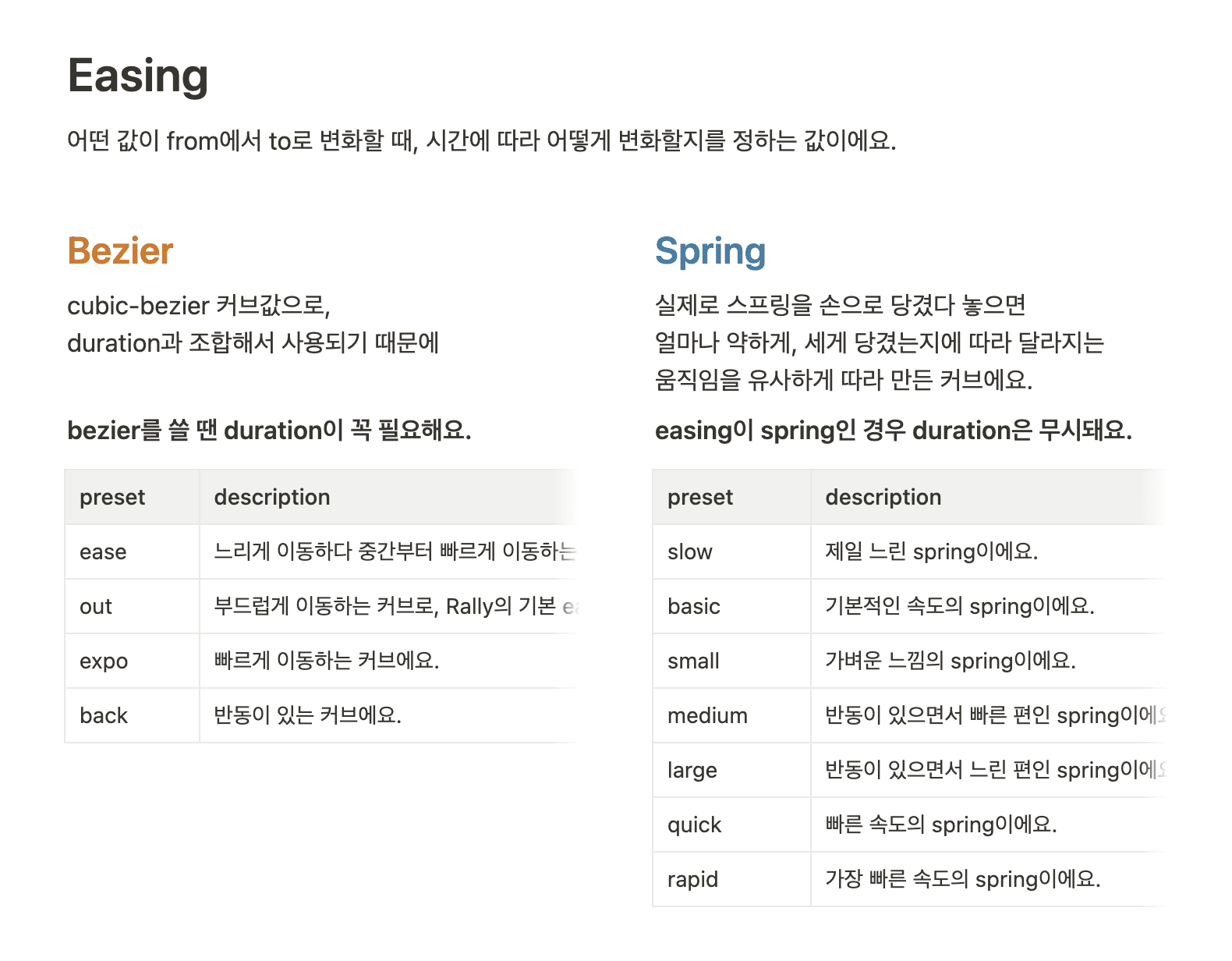 - 먼저 Easing (값이 시간에 따라 어떻게 변화할지)을 바탕으로 Rally의 최소 단위인 Motion (어떻게 움직일지)을 만들고,